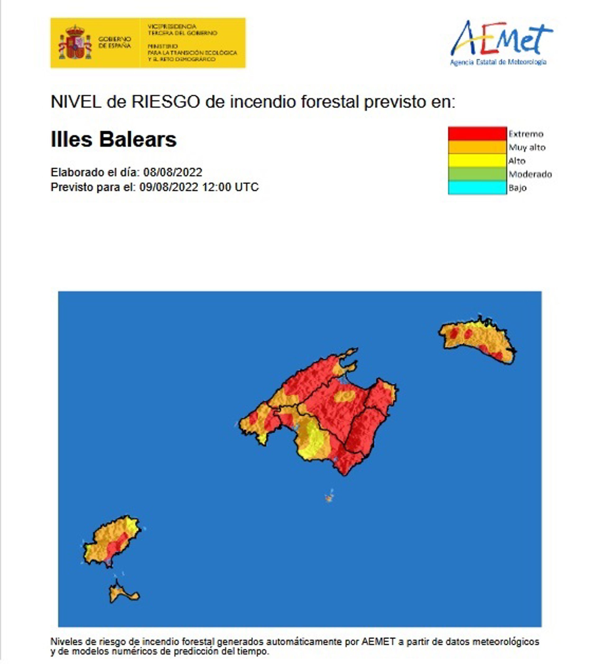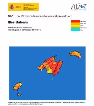Como consecuencia de esta advertencia, la Aemet ha indicado que el índice de riesgo de incendio en Baleares es extremo.