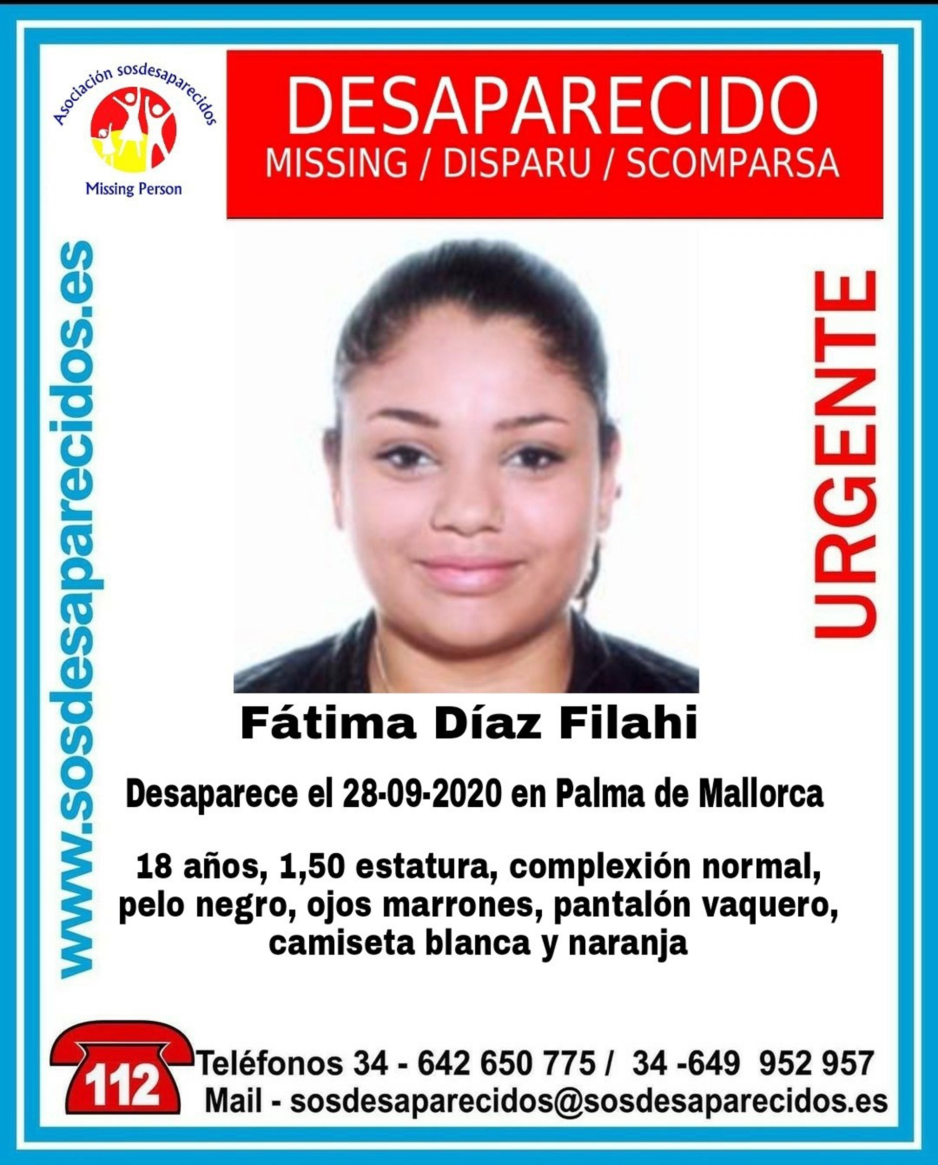 La Guardia Civil y la asociación SOS Desaparecidos han difundido la alerta de la desaparición de Fátima Díaz Filahi, de Palma, en paradero desconocido desde este martes.
