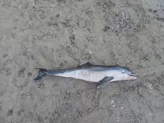 La corriente marina arrastró al pequeño cadáver de delfín hasta la playa donde ha sido hallado este martes. Al parecer, el mamífero recaló en la costa debido a la marejada de poniente.