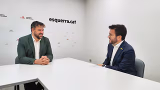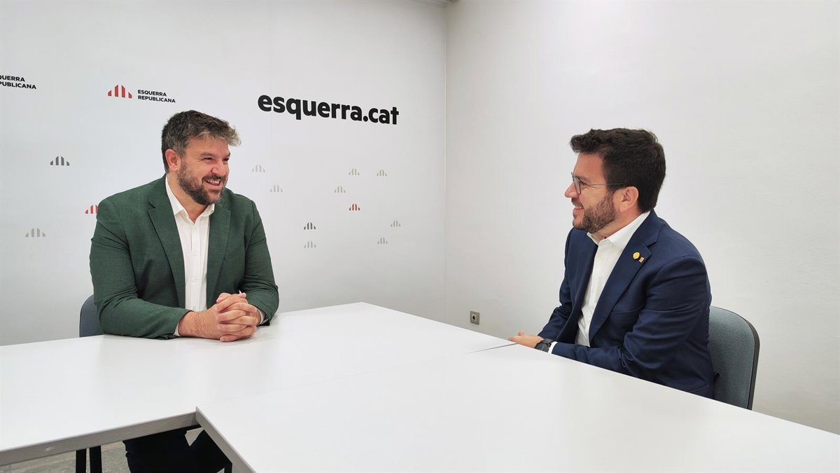 El candidato a la presidencia del Govern por MÉS per Mallorca, Lluís Apesteguia, y el presidente de la Generalitat de Catalunya y coordinador nacional de Esquerra Republicana, Pere Aragons, han acordado este jueves impulsar un circuito cultural en catalán para reforzar los intercambios de creadores e interpretes de Baleares y Catalunya.