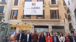 La secretaria general del PSIB, Francina Armengol, y otros representantes del PSIB ante la pancarta del 'no a la guerra' desplegada en la sede del partido en Palma. - EUROPA PRESS