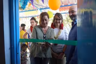 La presidenta del Govern, Francina Armengol, cortando la cinta inaugural de la colonia de viviendas de la Fundación Vicente Ferrer en Anantapur, India. - CAIB