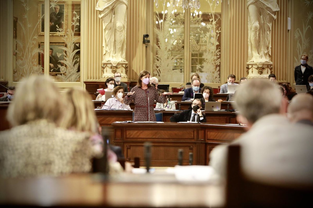 La presidenta del Govern, Francina Armengol, frente a la bancada del PP en el Parlament. - CAIB