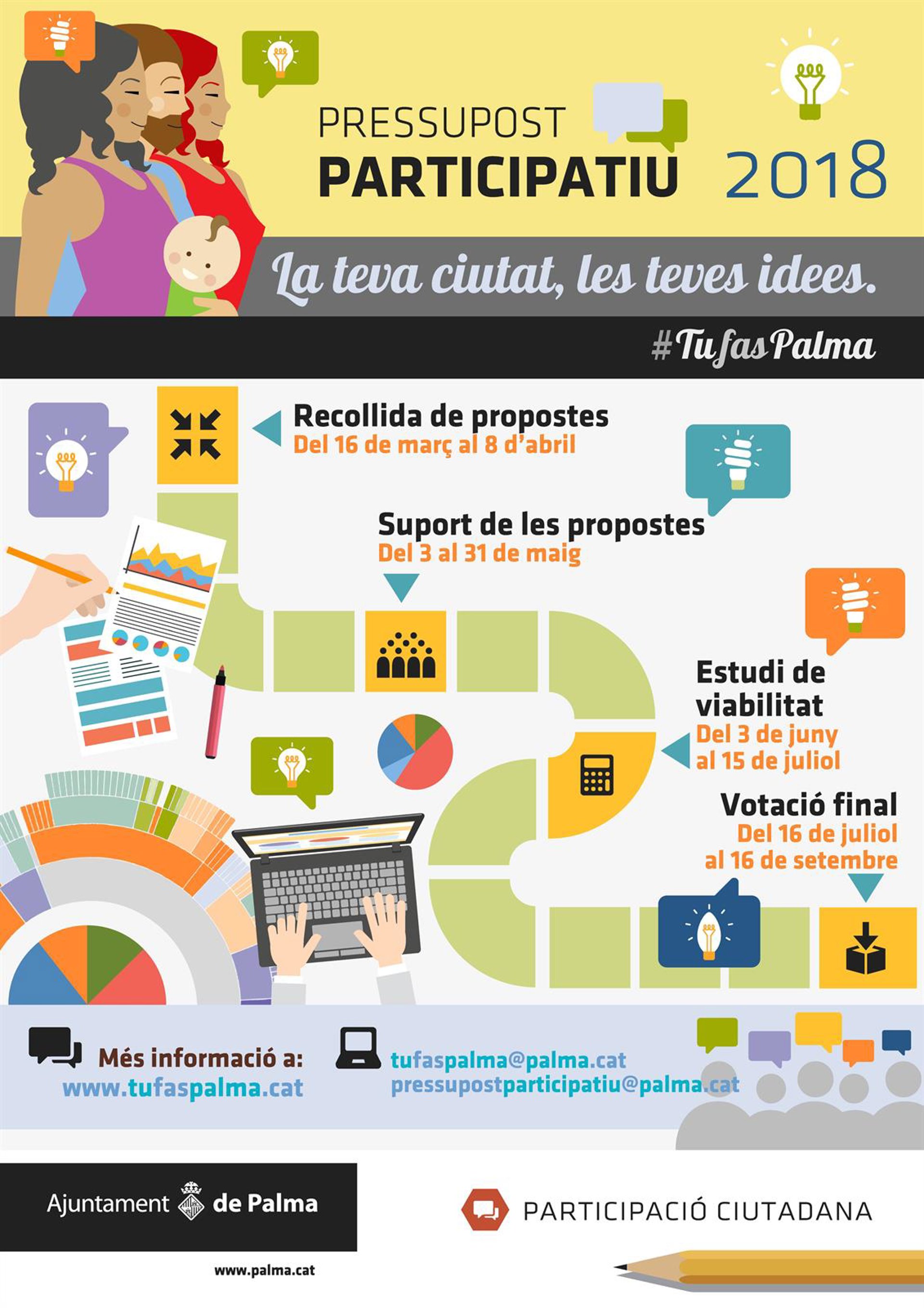 Según ha detallado el Consistorio palmesano, las entidades y personas individuales que han presentado propuestas tienen que recavar apoyos para sus proyectos vía www.tufaspalma.cat o bien presentando hojas de recogida de apoyo a las Oficinas de Atención a la Ciudadanía (OACS).
