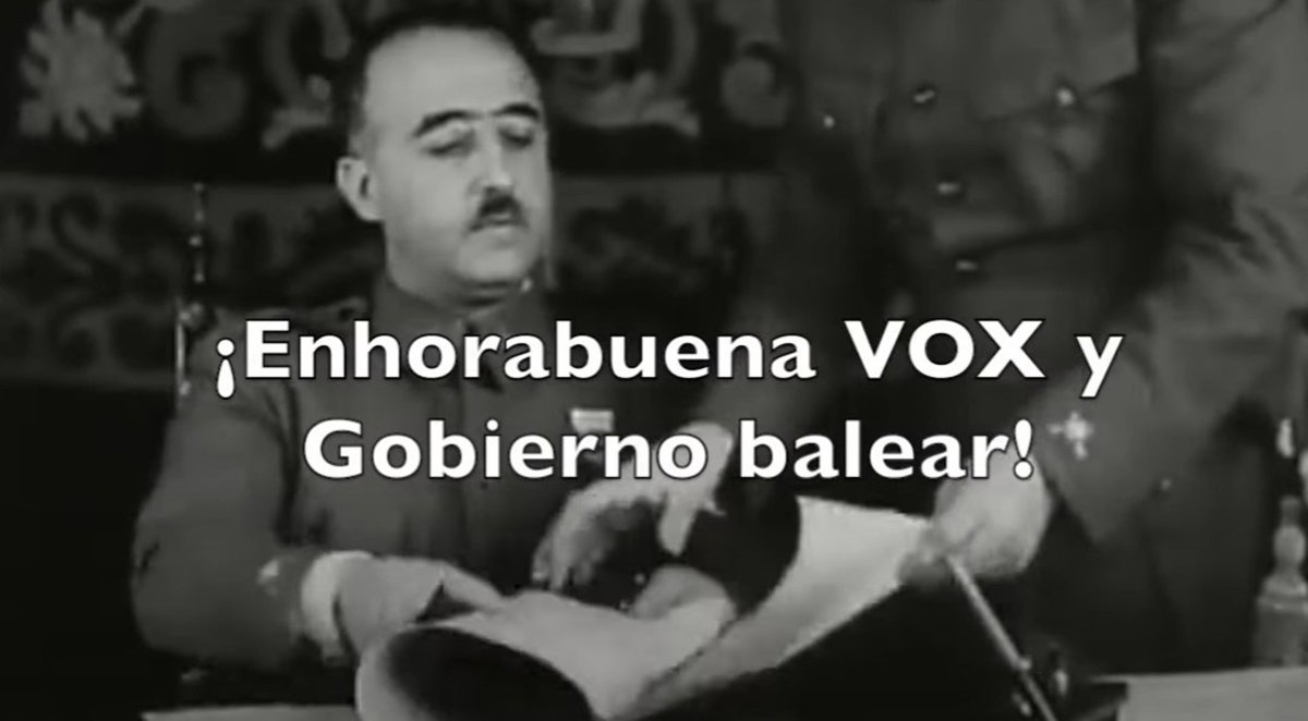 En el vídeo parodia aparece Franco dando la enhorabuena al Govern y a Vox ya que el acuerdo presupuestario "servirá en Baleares para acabar con la dictadura que maestros y profesores ejercen en las escuelas".
