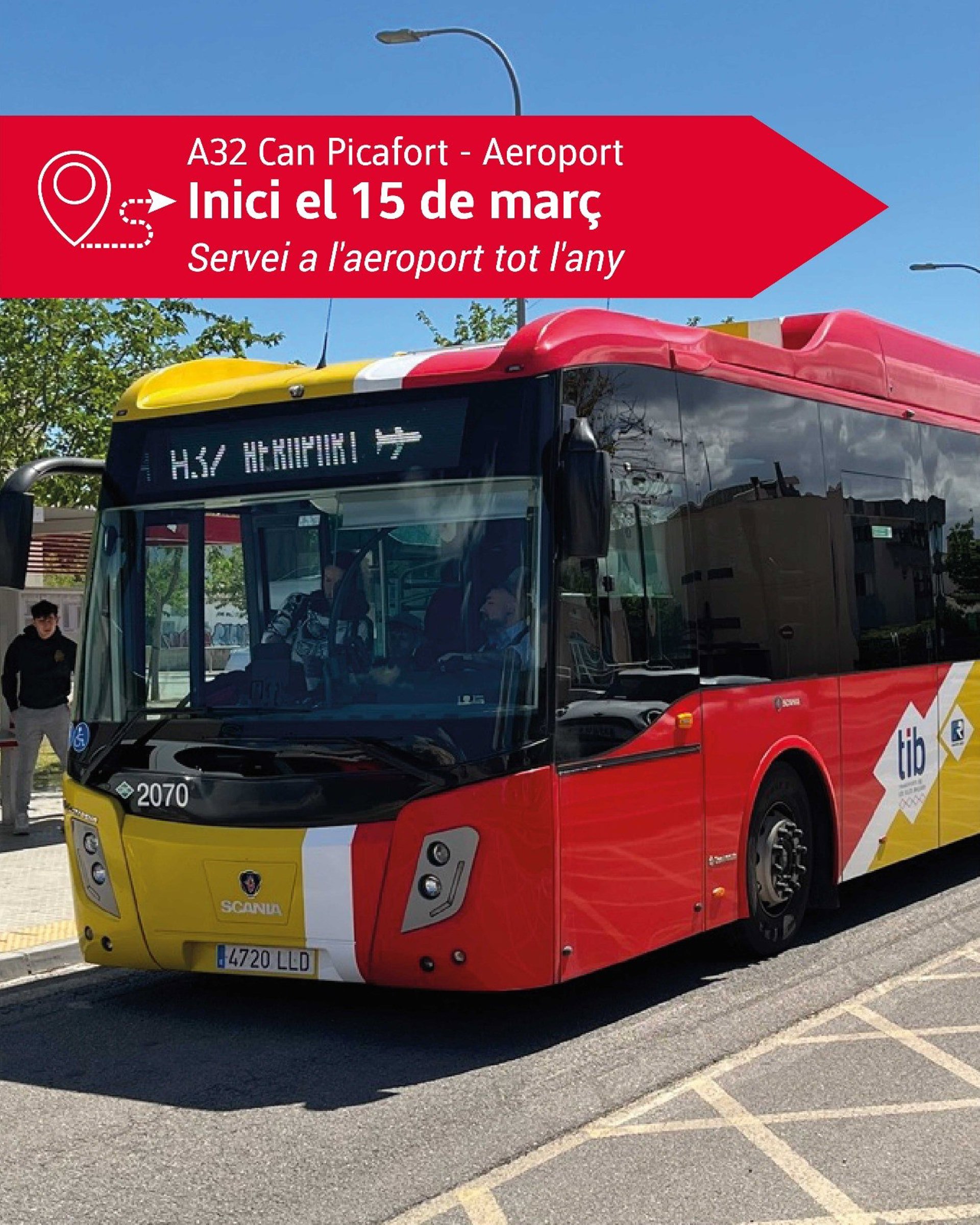 La línea A32 de los autobuses del TIB, que conectará municipios como Alcúdia, Sa Pobla o Inca con el aeropuerto de Son Sant Joan, comenzará a operar este sábado.