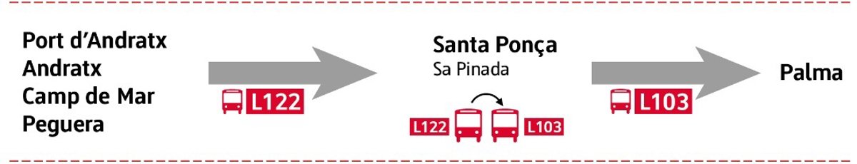 De este modo, a partir de lunes, para viajar entre el Port d'Andratx, Andratx, Camp de Mar, Peguera y Palma (y viceversa) se tendrá que hacer transbordo en la plaza de Santa Pona entre las líneas 122 y 103.