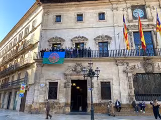 El alcalde de Palma, José Hila, miembros de la junta directiva de la asociación Pueblo Gitano y representantes de la corporación municipal, han colgado este viernes la bandera del Pueblo Gitano en el balcón de Cort para conmemorar el Día Internacional de este colectivo.