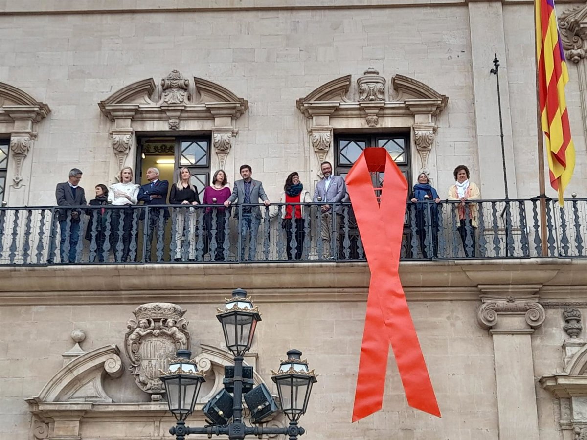 El Ayuntamiento de Palma ha colgado este jueves un lazo rojo de la fachada de Cort, que también se iluminará esta tarde con motivo del Día Mundial de la Lucha contra el SIDA.