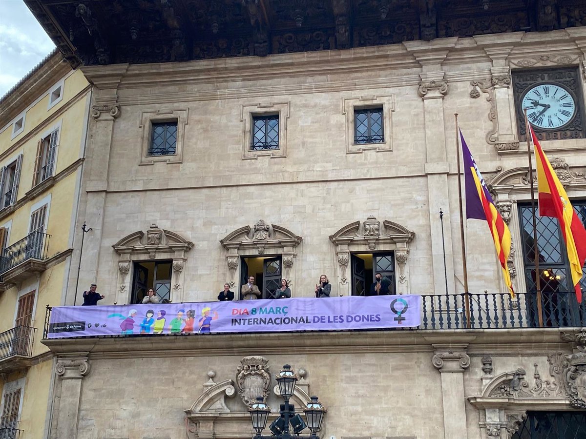 El Ayuntamiento de Palma ha colgado este lunes en su fachada una pancarta para conmemorar el 8 de marzo, Día Internacional de la Mujer.