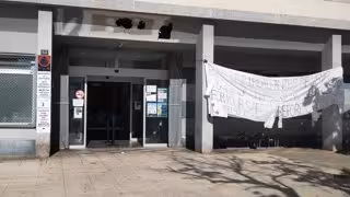 El centro de Salud de Son Gotleu, con una sábana colgada entre dos columnas pidiendo en tres idiomas (castellano, árabe e inglés) llamar por teléfono antes de acudir al centro. - EUROPA PRESS