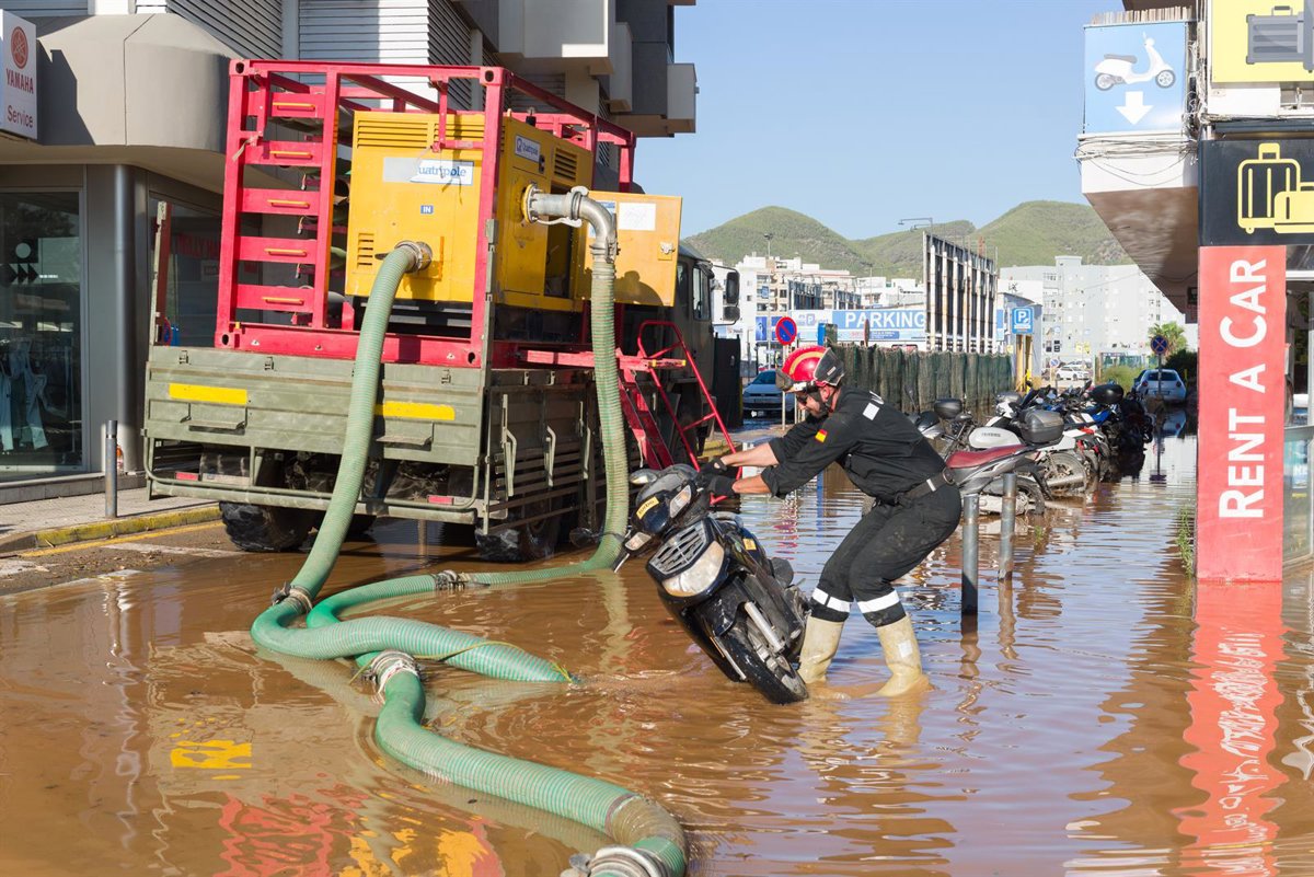 Archivo - Un militar de la UME aparta una moto de una calle anegada de agua tras las lluvias en Ibiza. - Germán Lama - Europa Press - Archivo