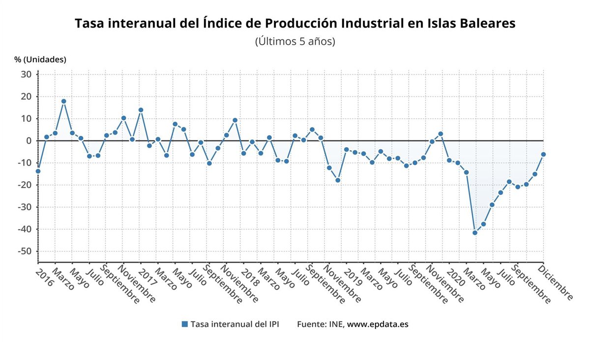 Baleares se sitúa así como la región con el índice de producción industrial más bajo, de 74,4 puntos, mientras que la media nacional es de 97,8. Solamente en el mes de diciembre, la caída es del 6,1%.