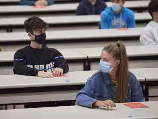 Alumnos sentados a la distancia segura en el inicio de curso de una universidad. - Eduardo Sanz - Europa Press