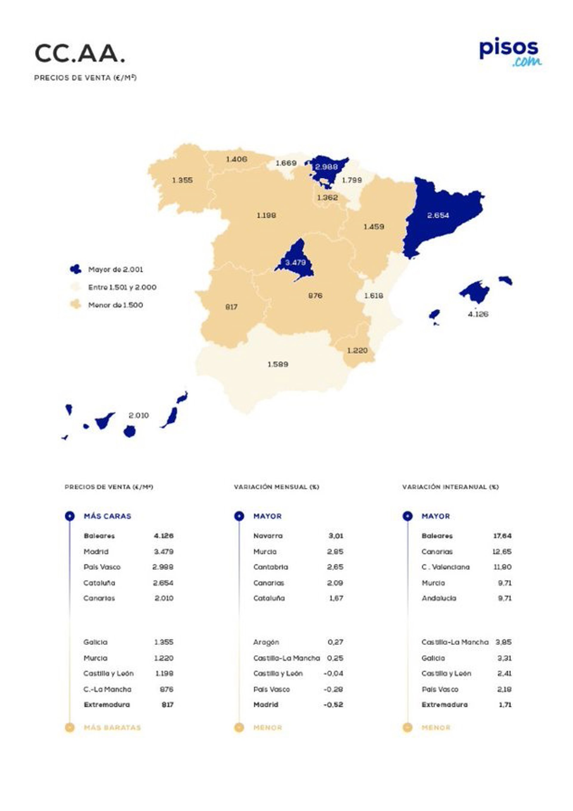 En este sentido, las Islas se convierten en la región más cara del país, teniendo por detrás a Madrid, con un precio medio de 3.479 euros por metro cuadrado, y País Vasco, con un precio medio de 2.988 euros por metro cuadrado.