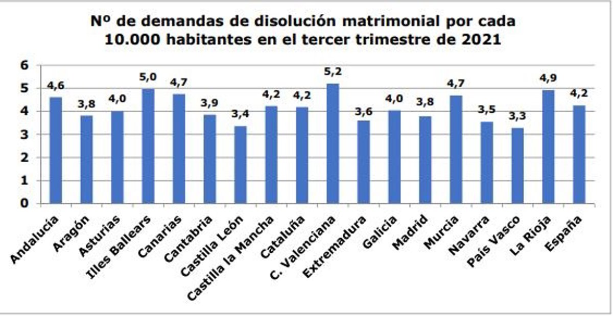 Por comunidades autónomas, el mayor número de demandas de disolución por cada 10.000 habitantes se ha registrado en la Comunidad Valenciana, con 5,2; Islas Baleares, con 5; La Rioja, con 4,9; Canarias y Murcia, con 4,7 y Andalucía, con 4,6. Todos estos territorios superan la media nacional, que es de 4,2.