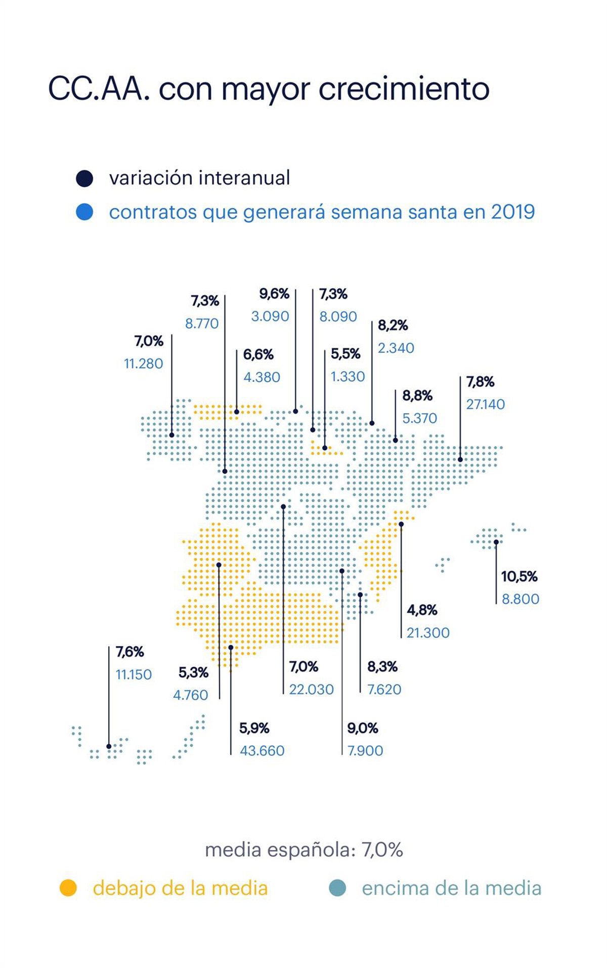 Respecto a las regiones en las que más crece el empleo, la empresa ha concretado que en 2019 el empleo vuelve a crecer en todas las regiones en la campaña de Semana Santa y ha avanzado que, después de Baleares, las comunidades que han registrado un mayor crecimiento de las contrataciones en Semana Santa son Cantabria (9,6%), Castilla-La