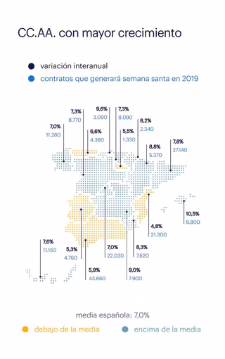 Respecto al conjunto del Estado, las previsiones de Randstad auguran que la campaña de Semana Santa generará 198.980 contratos en España, un 7 por ciento más que el volumen registrado en 2017 (186.018 contratos), una cifra que es la más alta del periodo estudiado pese a la desaceleración de 4,4 puntos porcentuales con respecto al crecimiento de 2018 (11,6%).