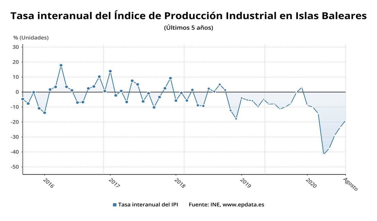 Desde mayo, Baleares ha sido cada mes la Comunidad con la peor tasa de producción industrial; entonces, durante el estado de alarma, esta tasa alcanzó hasta un -35,8%. La mayor caída este año en Baleares se produjo en abril, con un 41,6%.