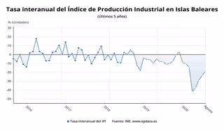 Baleares vuelve a ser en agosto, por cuarto mes consecutivo, la Comunidad con mayor caída interanual de la producción industrial, si bien se modera respecto a la tasa de julio al pasar del 24,2% a un 19%, según los últimos datos publicados este miércoles por el Instituto Nacional de Estadística.