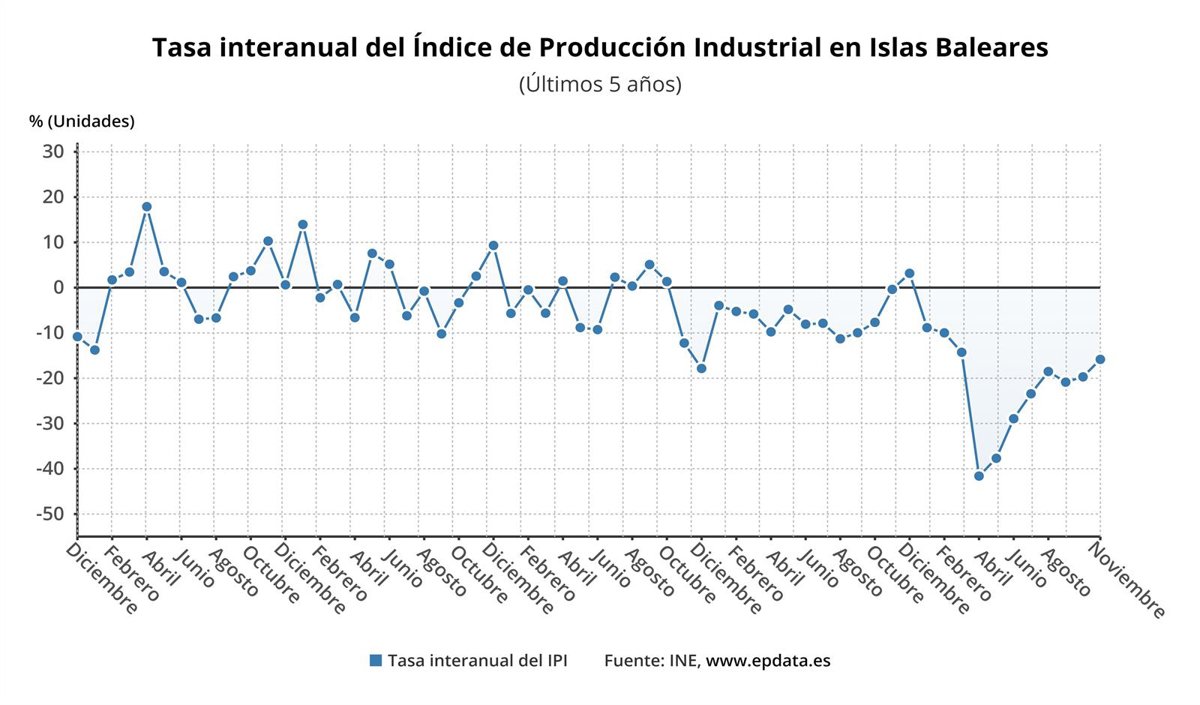 Baleares volvió a encabezar en noviembre el descenso de la producción industrial, según datos publicados este lunes por el Instituto Nacional de Estadística (INE), que cifra la caída del índice en un 15,8% interanual.