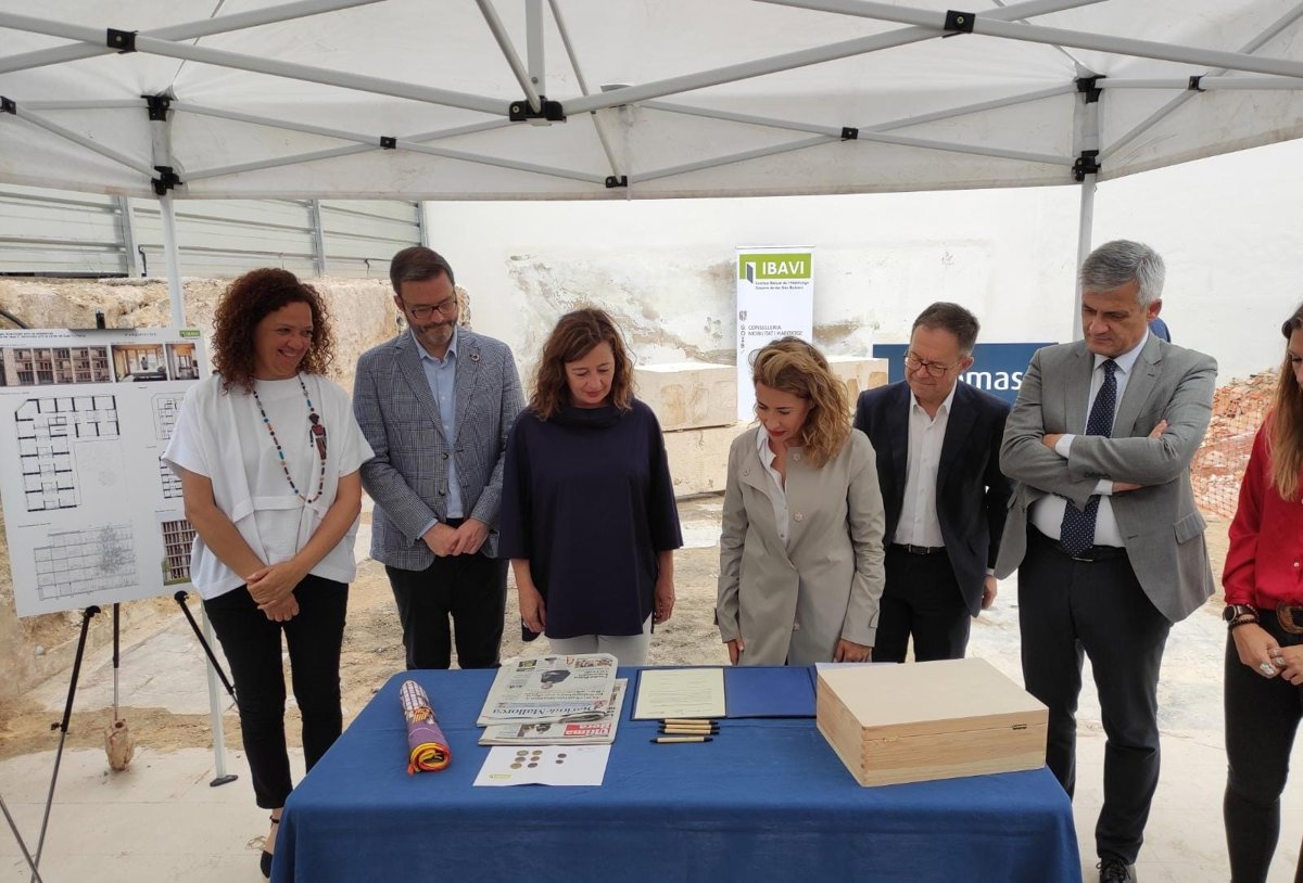 La presidenta del Govern, Francina Armengol, y la ministra de Transportes, Movilidad y Agenda Urbana, Raquel Sánchez, han puesto este viernes la primera piedra de esta promoción situada en la calle Lope de Vega.