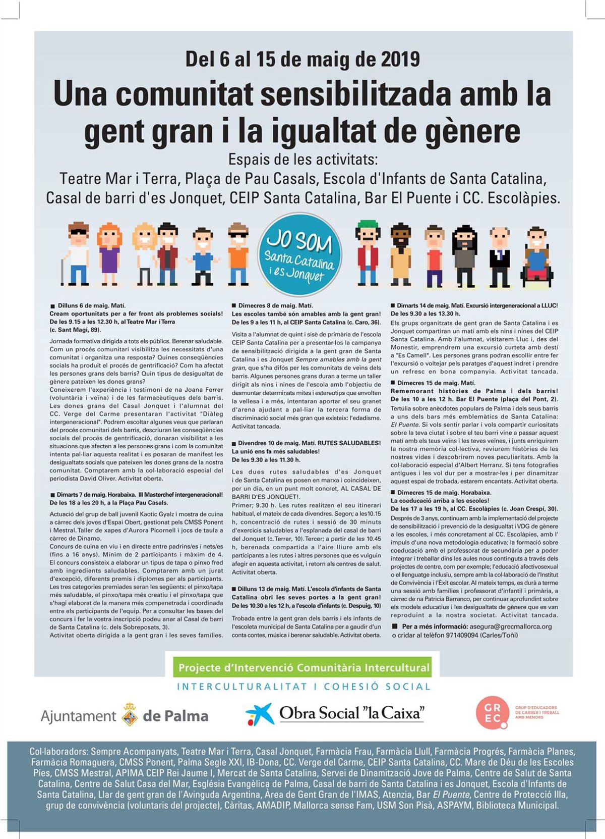 la asociación GREC y el Ayuntamiento de Palma, incluye jornadas formativas sobre el proceso de gentrificación de los barrios, talleres para trabajar la desigualdad de género, muestras de cocina, visitas de personas mayores a centros escolares, rutas saludables, cuentacuentos, tertulias sobre anécdotas populares de Palma o proyectos de coeducación.