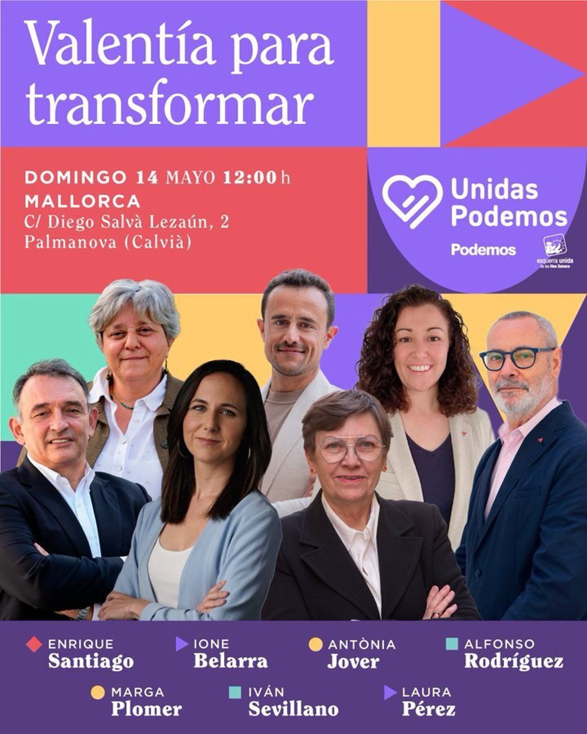 En este acto, participarán también la secretaria general de Podemos Baleares y candidata de Unidas Podemos a la presidencia del Govern, Antnia Jover; el secretario general del Partido Comunista (PCE), Enrique Santiago, y el candidato de Unidas Podemos al Consell de Mallorca, Iván Sevillano.