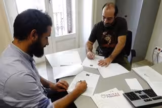 Alejandro López y Juanjo Martínez, firmando el acuerdo entre Podemos y EUIB. - PODEMOS