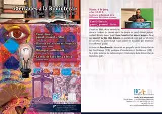 Concretamente, ha detallado, la primera charla, 'Canvi climtic: passat, present i futur', a cargo del meteorólogo Joan Barceló, se emitirá en directo el próximo jueves 4 de junio, a las 18.30 horas, a través del perfil de Facebook de la BCA y del canal de YouTube de la biblioteca.