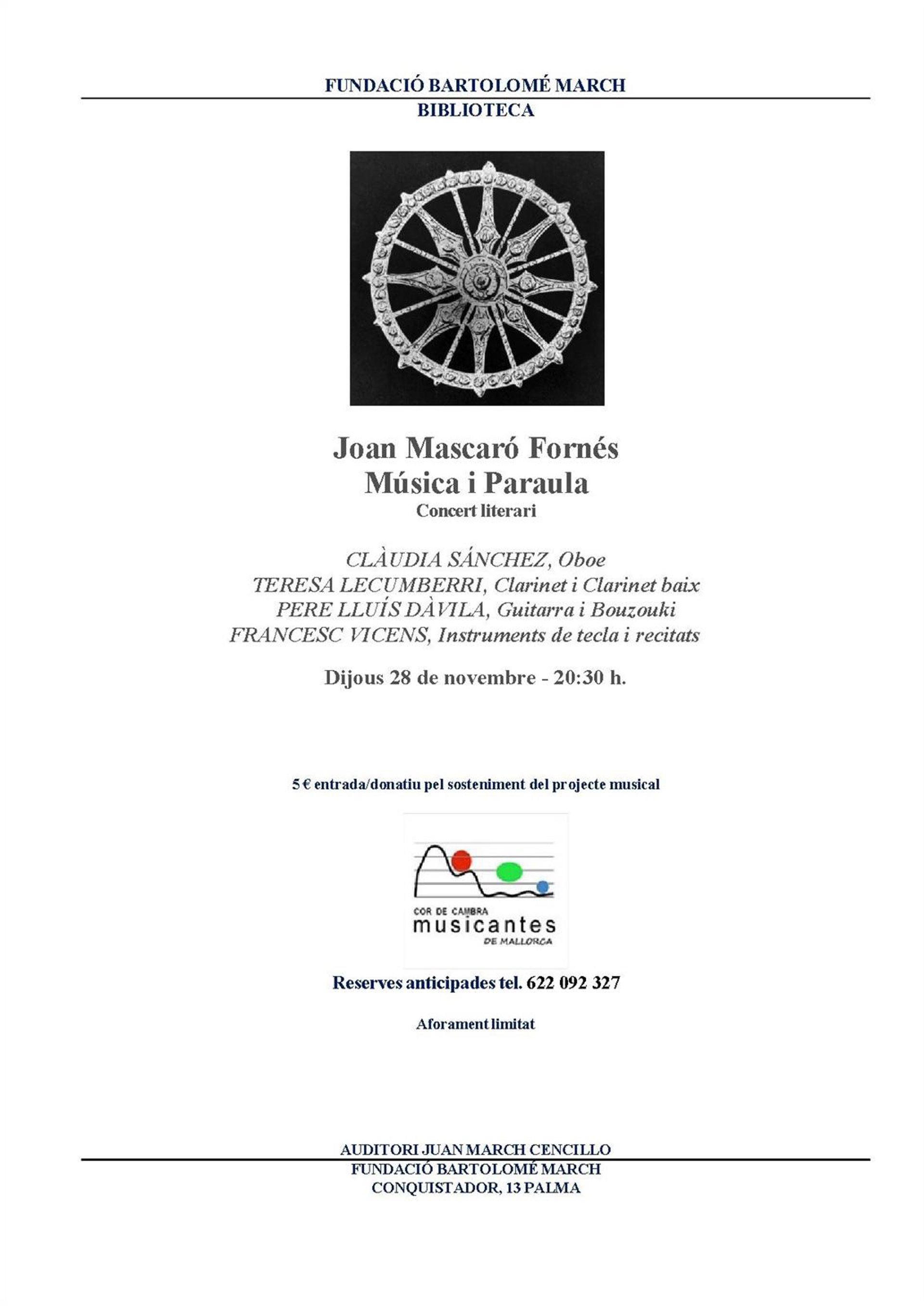 Cartel del concierto literario 'Joan Mascaró Fornés. Música i Paraula' - FUNDACIÓN BARTOLOMÉ MARCH