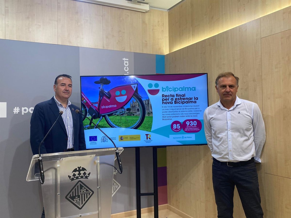 En una rueda de prensa, el regidor de Movilidad Sostenible, Francesc Dalmau, junto al gerente de la Sociedad Municipal de Aparcamientos y Proyectos (SMAP), Pedro Manera, han presentado este miércoles las novedades de BiciPalma, que supondrá una inversión de 2,9 millones de euros procedentes del Plan de Recuperación, Transformación y Resiliencia del Gobierno central, y de los fondos europeos NextGeneration.