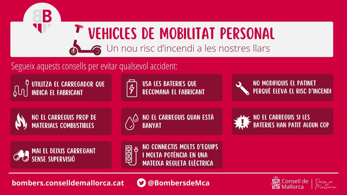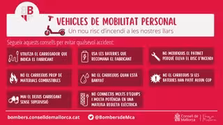 Bomberos de Mallorca, dependientes de la Dirección Insular de Emergencias del Consell de Mallorca, han iniciado una campaña de comunicación a través de las redes sociales para prevenir a la ciudadanía sobre el riesgo de incendio en las viviendas ocasionado por vehículos de movilidad personal, especialmente por la carga de las batería.