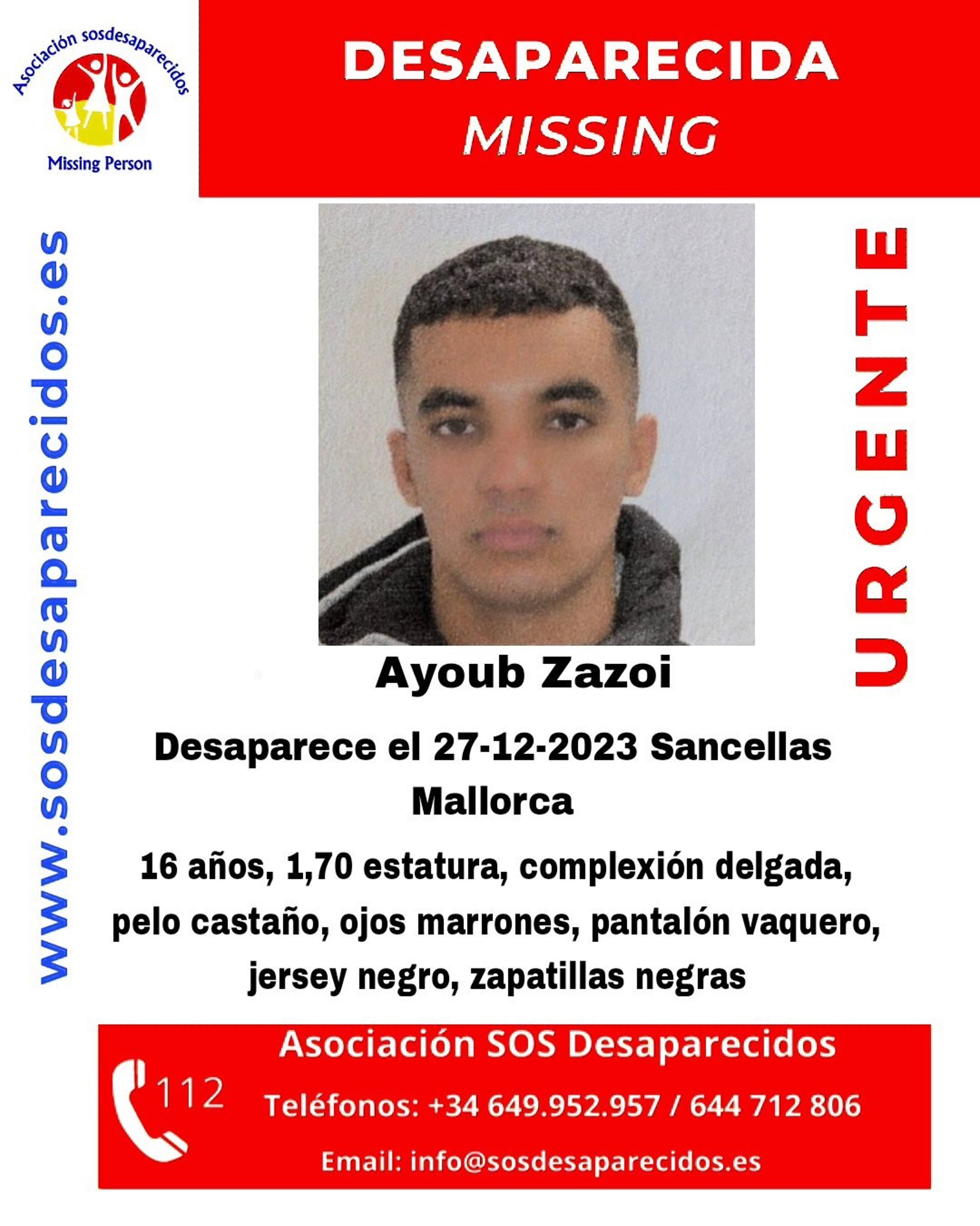 La asociación SOS Desaparecidos ha publicado la alerta de búsqueda de un adolescente de 16 años desaparecido en Sencelles desde el pasado 27 de diciembre.