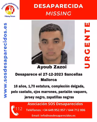 El menor responde al nombre de Ayoub Zazoi, mide 1,70 metros, tiene una complexión delgada, el pelo castaño, ojos marrones y la última vez que le vieron vestía un pantalón vaquero, jersey negro y zapatillas negras.