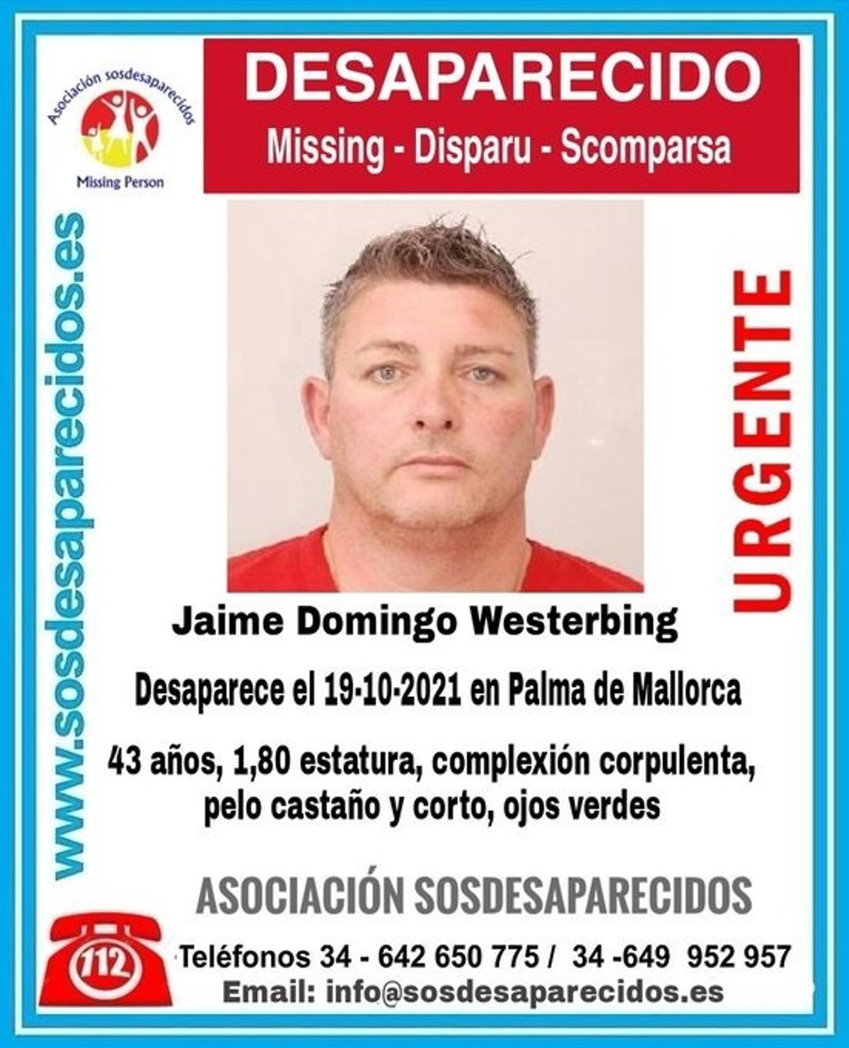 La asociación SOS Desaparecidos ha difundido este lunes una alerta por la desaparición de un hombre de 43 años, visto por última vez el pasado 19 de octubre, en Palma.
