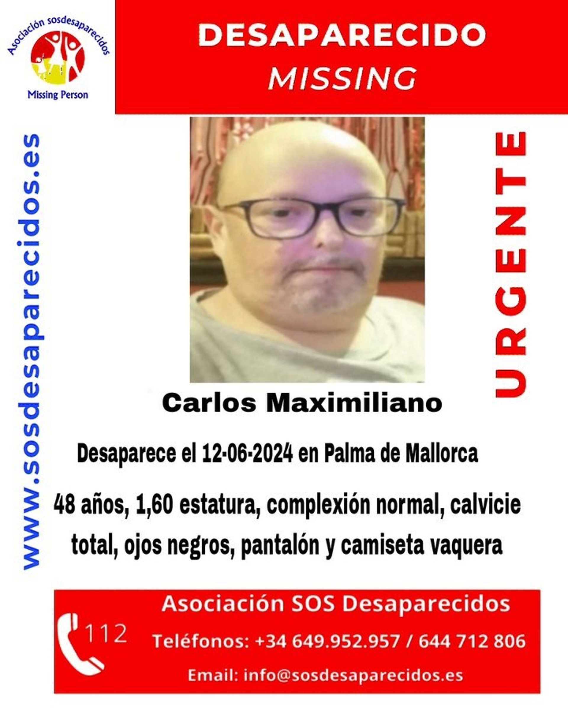 La asociación SOS Desaparecidos ha publicado la alerta por desaparición de un hombre de 48 años que fue visto por última vez en Palma el 12 de junio.