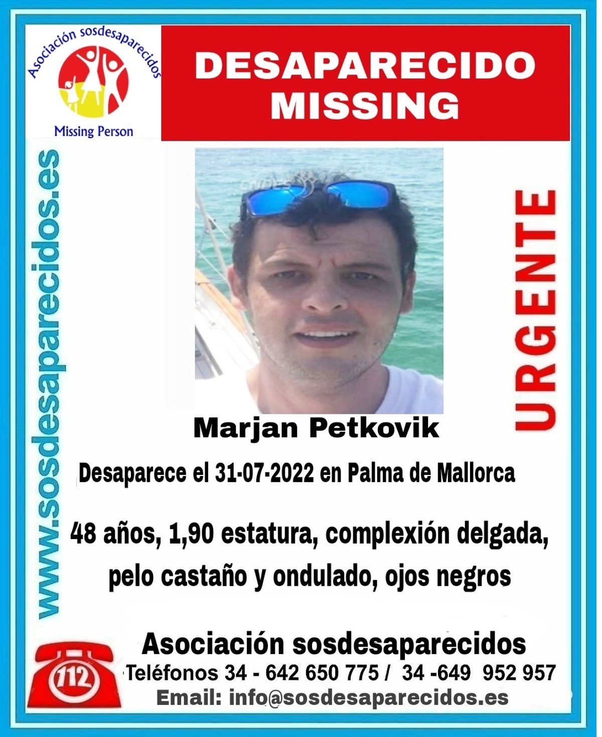 La asociación SOS Desaparecidos ha difundido este martes una alerta por la desaparición de un hombre, de 48 años de edad, visto por última vez el pasado domingo, 31 de julio, en Palma.