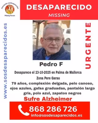 La asociación SOS Desaparecidos ha alertado de la desaparición de un hombre de 79 años y con alzheimer en Palma.