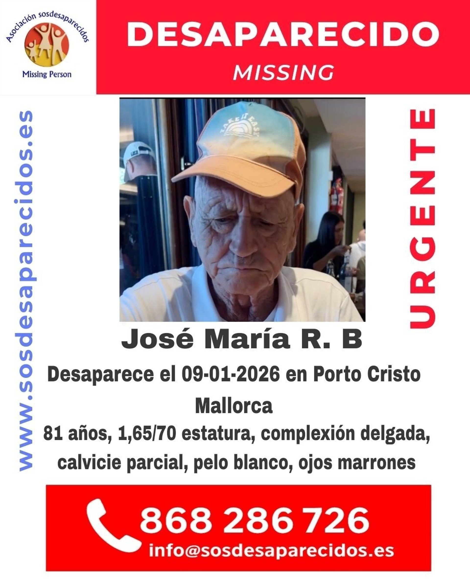 La asociación SOS Desaparecidos ha alertado de la desaparición de un hombre de 81 años en Porto Cristo al que se le perdió la pista hace casi dos semanas.