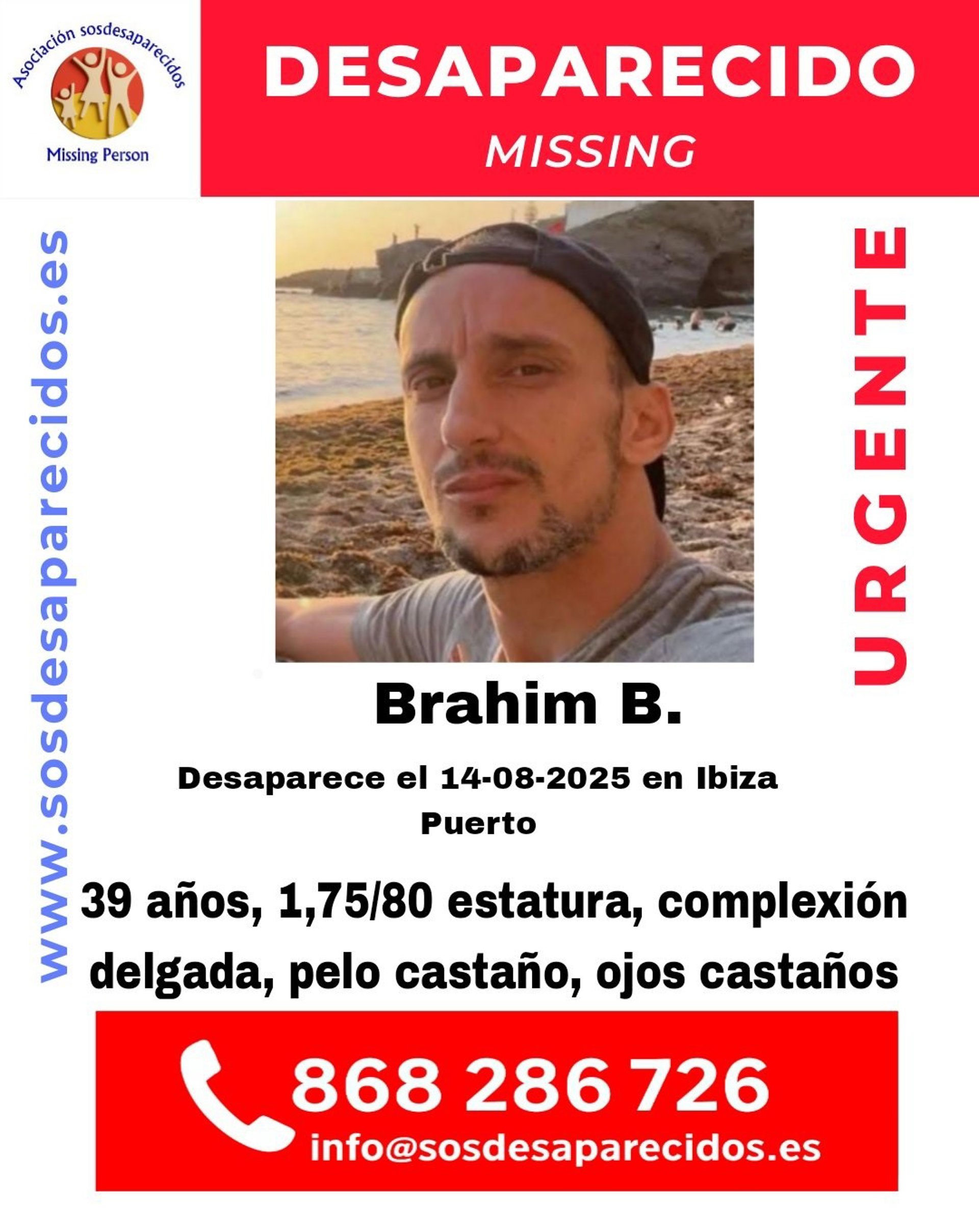 El hombre, según la información facilitada por la asociación, responde al nombre de Brahim B., mide entre 1,75 y 1.80 metros de altura y es de complexión delgada. Tiene el pelo y los ojos castaños.