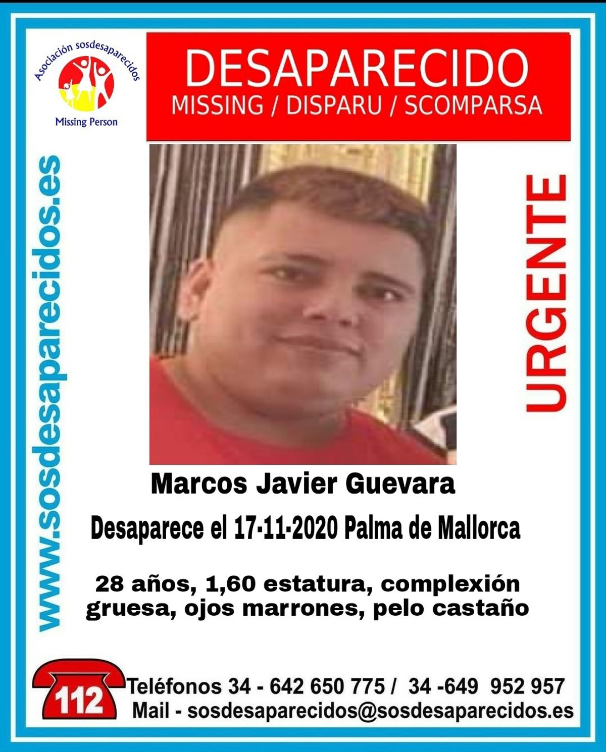 Se trata de Marcos Javier Guevara, del que la asociación ha difundido una fotografía y una descripción física para facilitar su descripción.