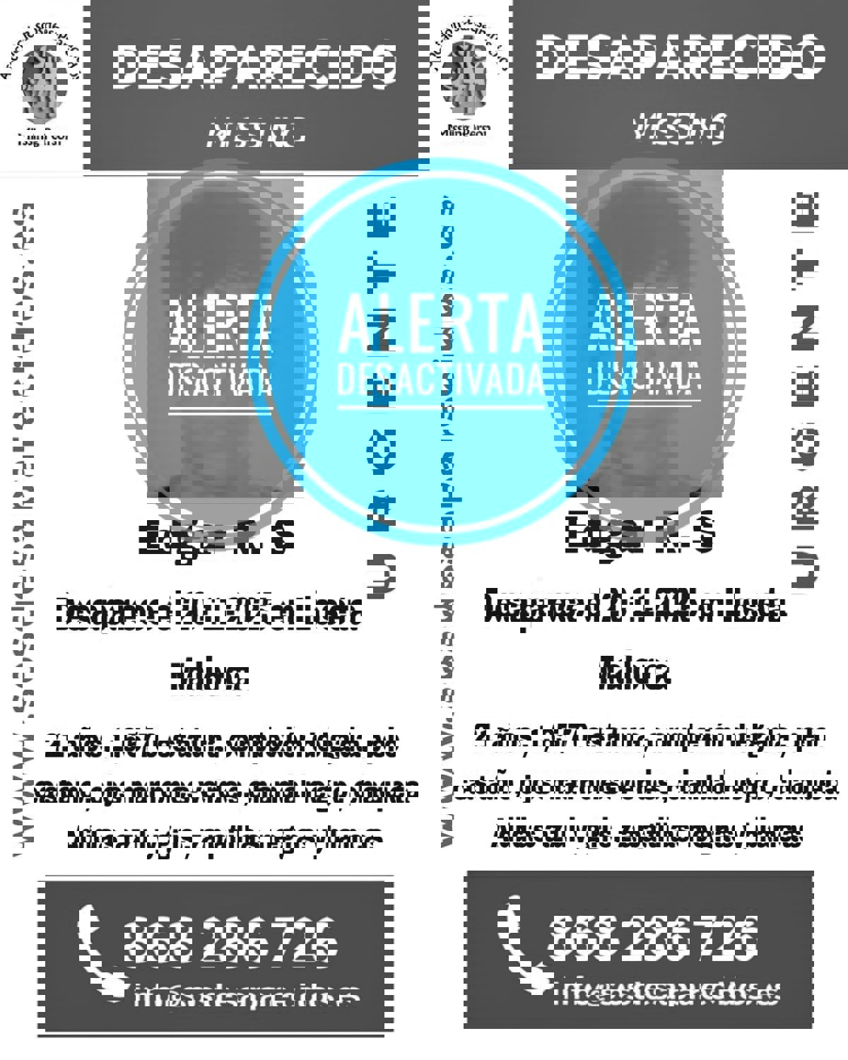 Se trata, concretamente, de Edgard R.S., según ha informado la asociación a través de un mensaje en la red social X, que ha acompañado de un cartel indicando la desactivación de la alerta y con una breve descripción del hombre.