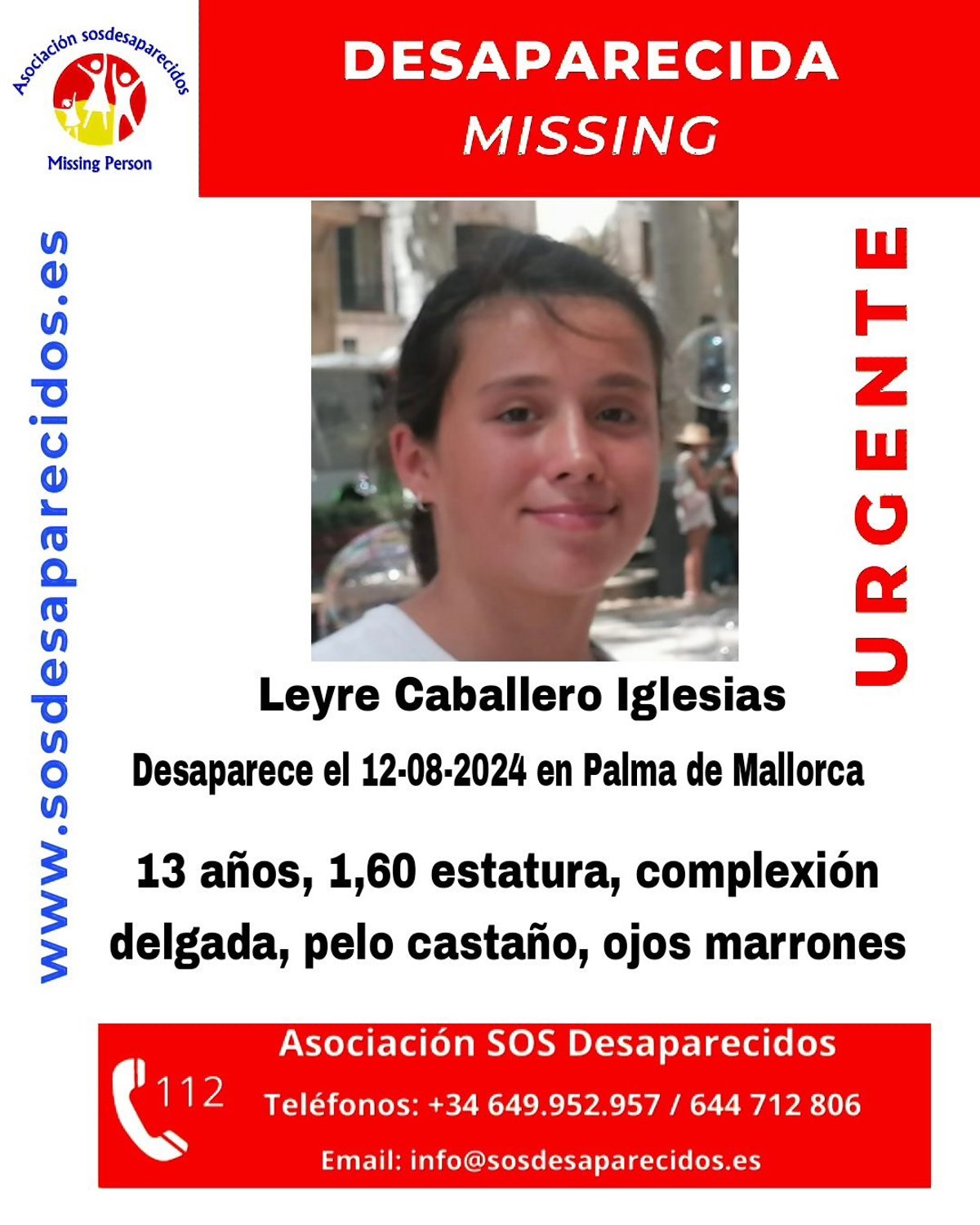 La asociación SOS Desaparecidos ha publicado este martes la alerta por desaparición de una menor de 13 años, vista por última vez en Palma este pasado lunes.