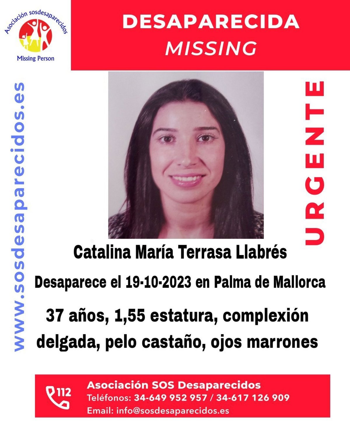 En un mensaje en la red social X (antes Twitter) la entidad ha explicado que la mujer se llama Catalina María Terrasa Llabrés, mide 1,55 metros y es de complexión delgada. Tiene el pelo castaño y los ojos marrones.