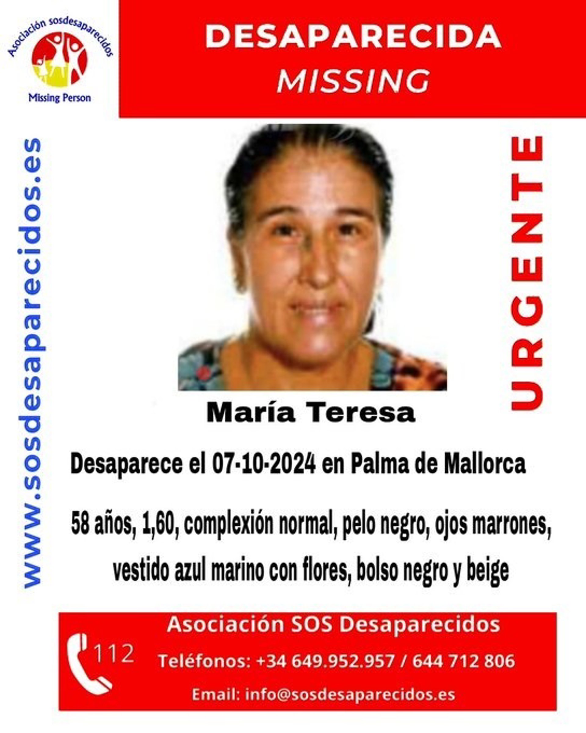 La asociación SOS Desaparecidos ha informado este miércoles sobre la desaparición el pasado día 7 de octubre de una mujer de 58 años en Palma.