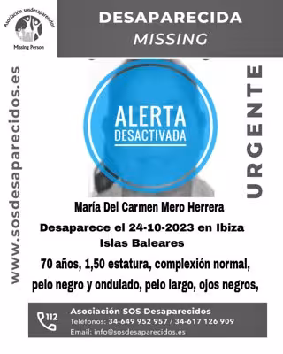 La asociación SOS Desaparecidos ha desactivado en la tarde de este martes la alerta lanzada para buscar a una mujer de 70 años desaparecida en Ibiza desde hacía una semana.