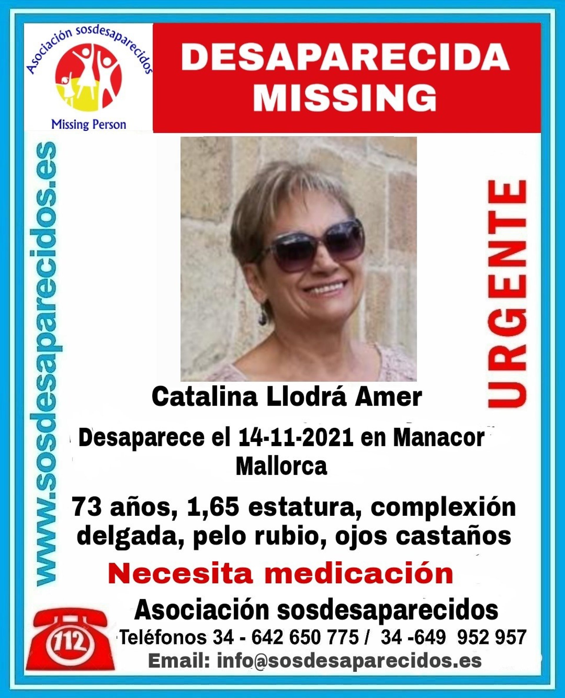La asociación Sos Desaparecidos ha informado de la desaparición de Catalina Llodrá Amer, desaparecida en Manacor en noviembre del año pasado.