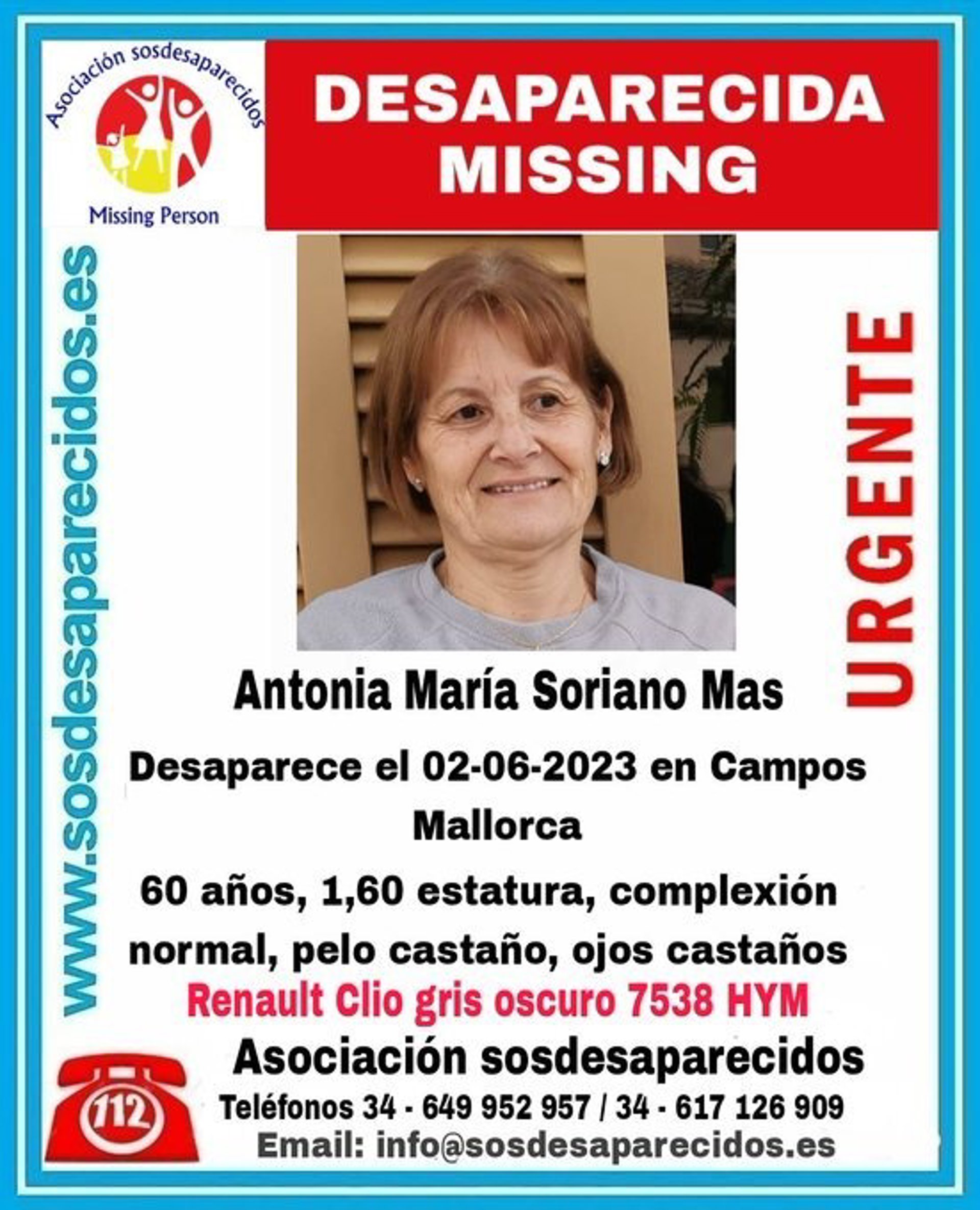 Según la información difundida a través de un mensaje en Twitter, recogido por Europa Press, la desaparecida responde al nombre de Antonia María Soriano Mas y tiene 60 años de edad.