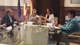 La consellera de Hacienda y Administraciones Públicas, Catalina Caldera, y el alcalde de Calvià, Alfonso Rodríguez, conjuntamente con la presidenta del Consejo Rector del OMT de Calvià, María del Carmen Iglesias, y la directora de la ATIB, Maria Antònia Truyols, han rubricado el acuerdo de colaboración que convierte a Calvià en la trigésimo segunda localidad de Mallorca donde se presta el Renta Ágil.